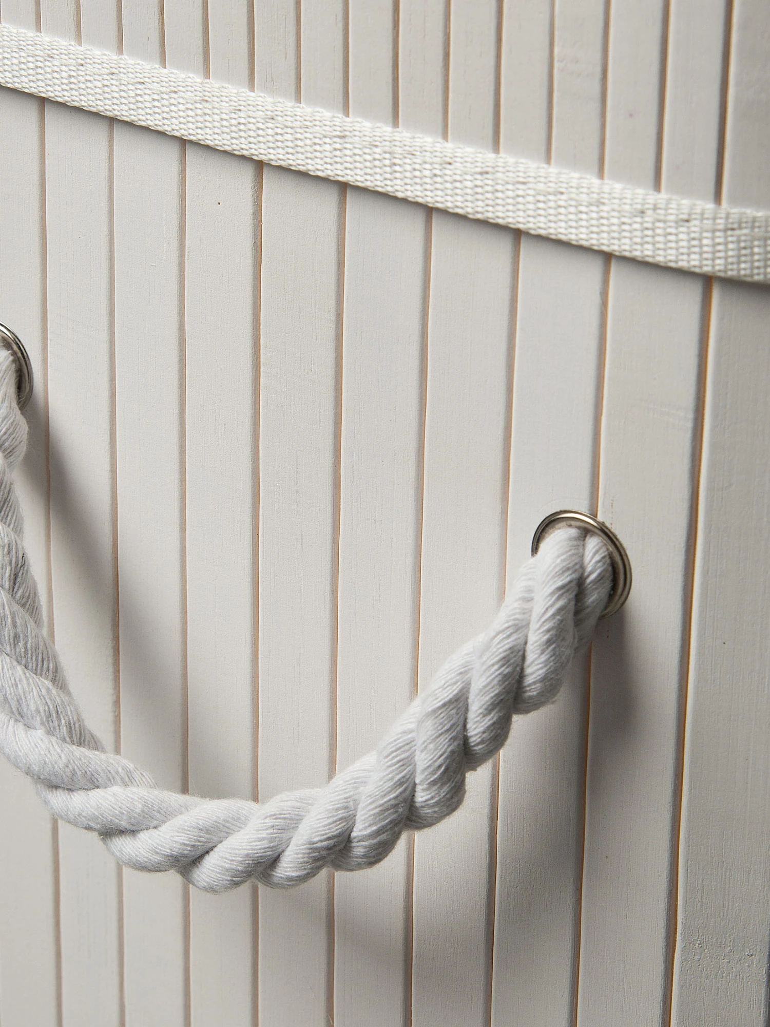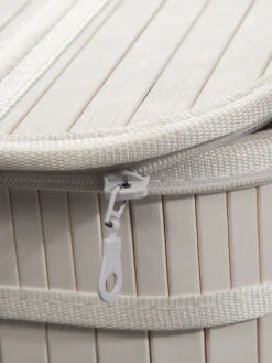 Extragroße Wäschetruhe aus Bambus. Das Innere ist mit Baumwollstoff ausgekleidet. Der Deckel ist an der Truhe mit einem Reißverschluss befestigt und kann auch komplett abgenommen werden. Der Korb hat zwei Kordel-Griffe.