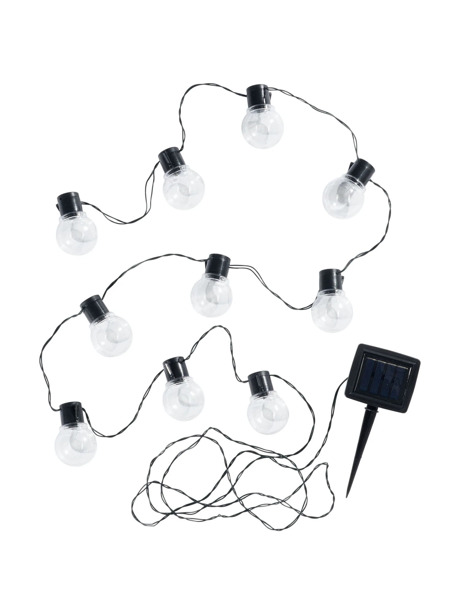 10 Kugeln mit je 5 cm Durchmesser und 1 LED warmweiĂź. Max. 0,06 W, ca. 2300 bis 2700K. Abstand zwischen den Kugeln ca. 20 cm. KabelzufĂĽhrung von 200 cm. Inkl. aufladbarer Batterie NI-HH AA 600MAH 1,2 V. ErdspieĂź mit Solarpanel. Betriebsdauer ca. 6 bis 8 Stunden. Inkl. Ein- Aus- Blinkerschalter. SpritzwassergeschĂĽtzt.