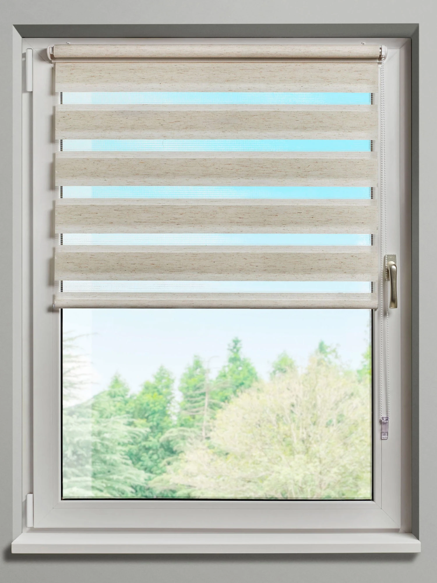 Beim DUO STARLIGHT liegen zwei Stoffbahnen übereinander, die wiederum transluzente und blickdichte Streifen haben. Je nach Stellung der Bahnen zueinander können Sie den Lichteinfall regulieren. Hierzu bedienen Sie ganz einfach den Kettenzug. Für die bohrfreie Montage am Fensterrahmen werden praktische Klemmträger mitgeliefert. Zusätzlich sind Clips für die Deckenmontage im Lieferumfang enthalten.