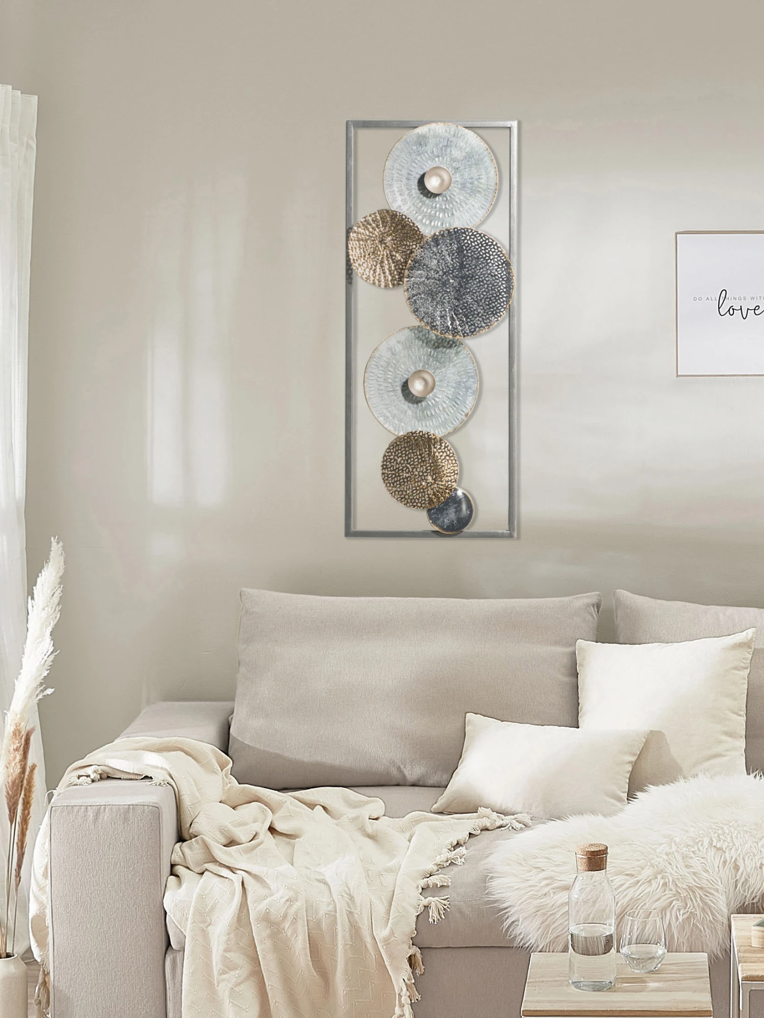 SEAFLOWERS ist ein besonderes Wandobjekt aus verschieden gestalteten Scheiben in unterschiedlicher Farbgebung, unterschiedlichen Strukturen und unterschiedlichen Größen. Aus Metall gefertigt. Größe: ca. 34,5 x 28,5 x 64,5 cm.